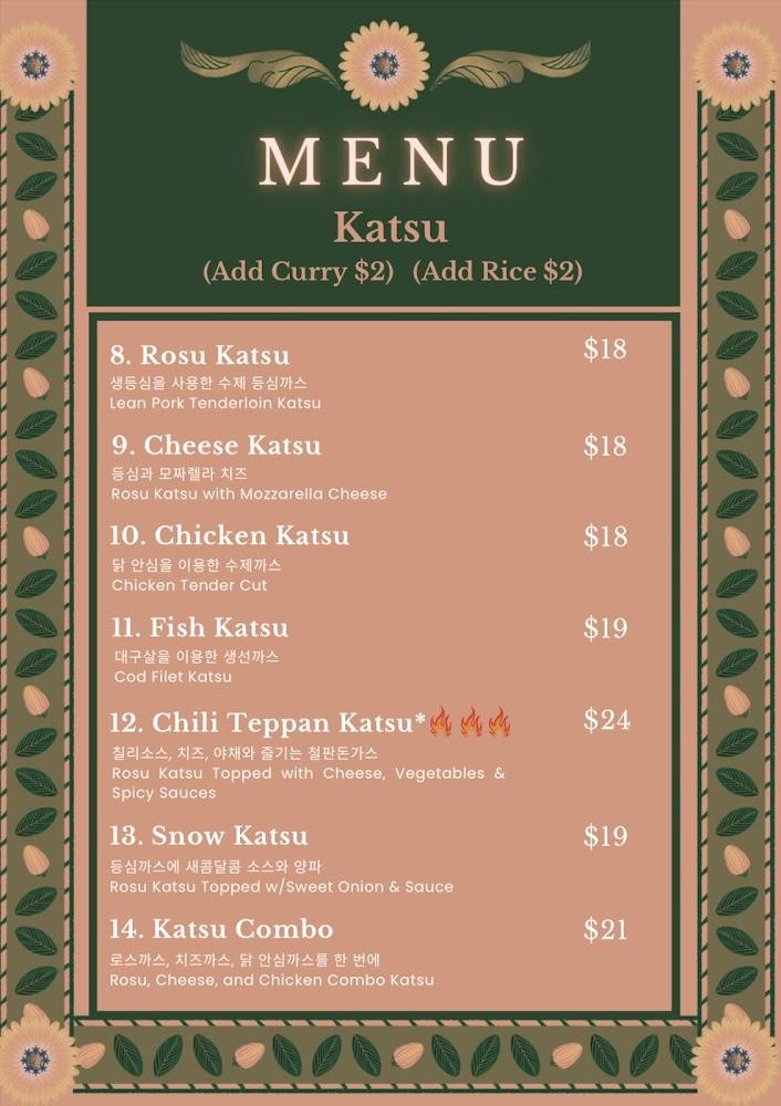 KAZ ONE presents an exciting menu fusing Korean and Japanese flavors. From Katsu to Curry, the variety captivates every palate. Popular choices include Chicken Katsu, a crispy delight, and Rosu Katsu, which is rich in flavor. Noodle dishes like Tonkotsu Ramen serve as comforting classics. Each dish showcases quality ingredients and thoughtful preparation. The appetizers also impress; Tempura Shrimp and Corn Cheese build anticipation for the main event. The dessert offerings round out the experience, providing the perfect sweet finish. That careful attention to culinary detail enhances each visit. Guests often leave eager to return and try more.